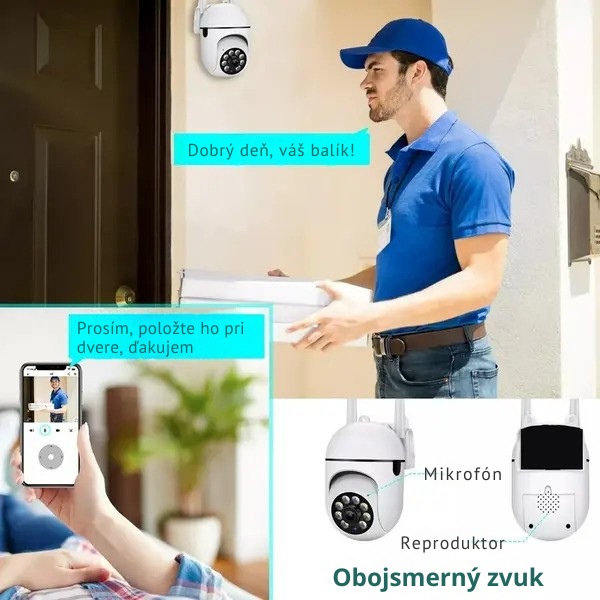Môžete počúvať a hovoriť cez aplikáciu pomocou vstavaného responzívneho mikrofónu na vašej vonkajšej bezpečnostnej kamere. Obojsmerný zvuk umožňuje komunikáciu s vítanými priateľmi a alarm detekcie pohybu vás môže zbaviť nežiaducich hostí alebo zvierat.