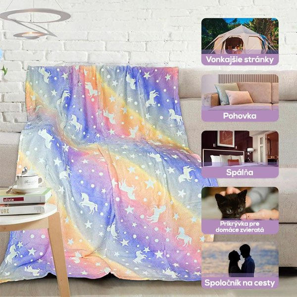 Príjemná a teplá deka vyžaruje počas noci jas! Môžete si vybrať vzor jednorožca alebo dinosaura!
