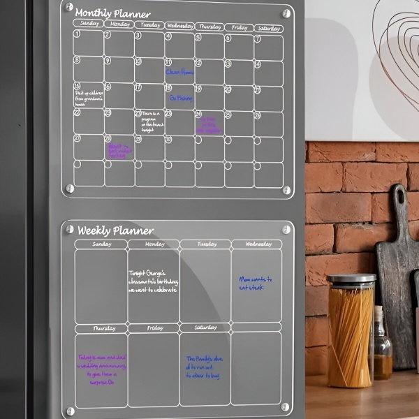 Akrylová súprava kalendárov na chladničku – Mesačný + týždenný plánovač (každý 40 x 30 cm), 4 magnety, stierateľný nasucho, fixky v balení | REUSABLEPLAN 1+1 ZADARMO